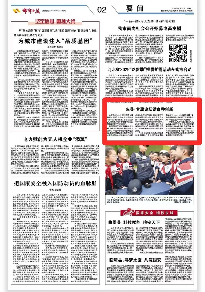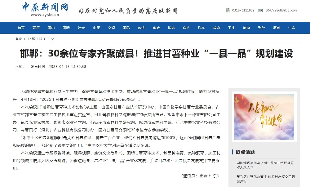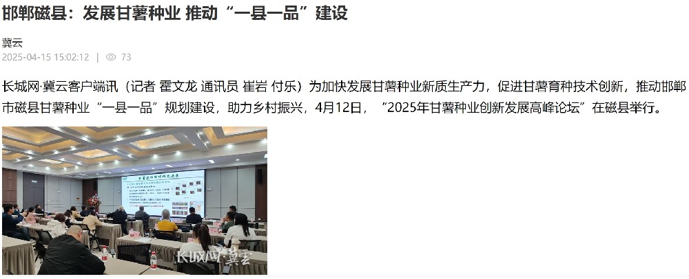 2025年4月15日,邯鄲日報發(fā)布題為《磁縣:甘薯論壇話育種創(chuàng)新》的報道,此次論壇的召開,旨在促進甘薯育種技術創(chuàng)新,推動磁縣甘薯種業(yè)“一縣一品”規(guī)劃建設,助力鄉(xiāng)村振興。