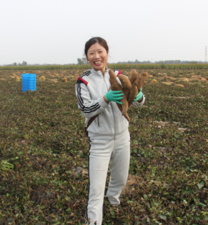 育種人王慶美手捧著單株多塊的濟紫薯1號