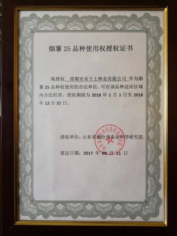 2017年9月11日,邯鄲市禾下土種業(yè)有限公司與煙臺市農(nóng)業(yè)科學(xué)院在山東煙臺簽定"煙薯25"甘薯品種使用權(quán)許可合同,有效日期15年。
