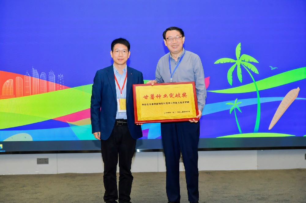 2024年12月6日,中國(??冢﹪H三薯發(fā)展大會(huì)在海南??趪H會(huì)展工場盛大開幕。中國甘薯首席科學(xué)家李強(qiáng)、馬鈴薯首席科學(xué)家李廣存、木薯原首席科學(xué)家李開綿等國內(nèi)外三薯行業(yè)領(lǐng)域權(quán)威專家、優(yōu)秀企業(yè)代表齊聚海口,創(chuàng)新三薯產(chǎn)業(yè)鏈、保障糧食供應(yīng)鏈。邯鄲市禾下土種業(yè)有限公司作為國家種業(yè)陣型企業(yè)受邀出席會(huì)議,并作《引領(lǐng)甘薯種業(yè)創(chuàng)新,推動(dòng)甘薯產(chǎn)業(yè)高質(zhì)量發(fā)展》主題報(bào)告。在大會(huì)上,為表彰禾下土在甘薯種苗研發(fā)和育種上的重大技術(shù)突破,禾下土種業(yè)被授予“甘薯種業(yè)突破獎(jiǎng)”。江蘇徐淮地區(qū)徐州市農(nóng)科所副所長、甘薯副首席科學(xué)家曹清河研究員為崔伏喜總經(jīng)理頒授獎(jiǎng)牌。禾下土將繼續(xù)加強(qiáng)甘薯種苗研發(fā)和育種上的資金和人才投入,積極發(fā)揮甘薯種業(yè)核心優(yōu)勢,引領(lǐng)甘薯種業(yè)創(chuàng)新,推動(dòng)中國甘薯產(chǎn)業(yè)高質(zhì)量發(fā)展。
