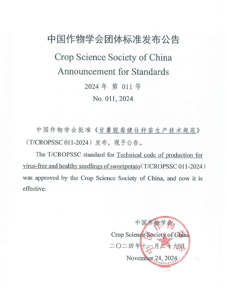由中國作物學(xué)會(huì)甘薯專業(yè)委員會(huì)、江蘇徐淮地區(qū)徐州農(nóng)業(yè)科學(xué)研究所、邯鄲市禾下土種業(yè)有限公司共同起草的團(tuán)體標(biāo)準(zhǔn)《甘薯脫毒健壯種苗生產(chǎn)技術(shù)規(guī)范》(T/CROPSSC 011-2024)獲得批準(zhǔn)發(fā)布,于2024年11月29日正式實(shí)施。本團(tuán)體標(biāo)準(zhǔn)由馬代夫研究員、曹清河研究員、王玉文董事長等擔(dān)任主要起草人,結(jié)合寶貴的專業(yè)經(jīng)驗(yàn)和實(shí)踐經(jīng)驗(yàn),對苗床苗、苗圃苗、大田繁殖苗在脫毒健壯種苗的質(zhì)量要求、育苗環(huán)境和設(shè)施、培育流程、采苗管理、運(yùn)輸?shù)确矫孢M(jìn)行了詳細(xì)梳理闡述,為國內(nèi)甘薯脫毒健壯種苗的標(biāo)準(zhǔn)化、規(guī)?;庇峁┘夹g(shù)參考。本團(tuán)體標(biāo)準(zhǔn)的實(shí)施,也將為我國甘薯產(chǎn)業(yè)的高質(zhì)量發(fā)展發(fā)揮良好的推動(dòng)作用。