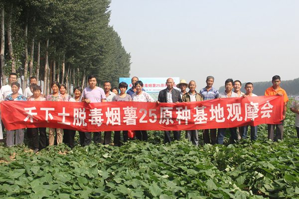 2017年9月12日,邯鄲市禾下土種業(yè)有限公司脫毒煙薯25原種基地觀摩會(huì)在磁縣召開(kāi),來(lái)自全國(guó)的煙薯25種植農(nóng)戶(hù)30余人到基地參觀。禾下土公司崔永平、栗維杰經(jīng)理帶領(lǐng)大家參觀了脫毒甘薯組培中心、甘薯貯藏窖、標(biāo)準(zhǔn)育苗大棚和原種基地,在培訓(xùn)室進(jìn)行了交流溝通。大家對(duì)于禾下土脫毒煙薯25原種長(zhǎng)勢(shì)表現(xiàn)給予稱(chēng)贊,為種植煙薯25實(shí)現(xiàn)高產(chǎn)、優(yōu)質(zhì)、高商品率和高效益充滿(mǎn)信心。邯鄲市禾下土種業(yè)有限公司是煙臺(tái)農(nóng)科院"煙薯25"品種使用權(quán)許可單位,專(zhuān)業(yè)脫毒煙薯25原種、原種苗生產(chǎn),歡迎全國(guó)甘薯專(zhuān)業(yè)種植農(nóng)戶(hù)到禾下土脫毒甘薯種苗基地考察!
