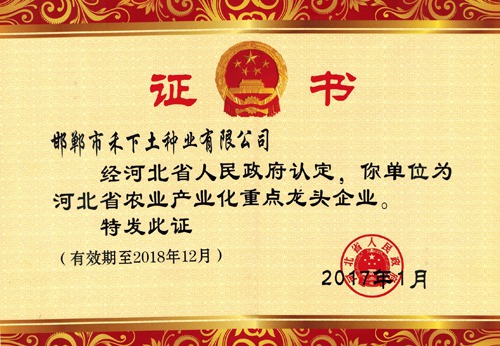 2017年邯鄲市禾下土種業(yè)有限公司被河北省人民政府授予河北省農(nóng)業(yè)產(chǎn)業(yè)化重點龍頭企業(yè),此項榮譽是河北省人民政府對禾下土種業(yè)長期以來在農(nóng)業(yè)科研、技術(shù)創(chuàng)新、產(chǎn)業(yè)化發(fā)展、服務(wù)帶動等方面給予的充分肯定,也進(jìn)一步堅定了禾下土加快農(nóng)業(yè)產(chǎn)業(yè)化發(fā)展的信心與步伐。禾下土種業(yè)自2002年成立以來,發(fā)展了脫毒甘薯、小麥良種繁育、磁州白蓮藕三大農(nóng)業(yè)產(chǎn)業(yè)、建立了三個規(guī)模化現(xiàn)代農(nóng)業(yè)示范基地。其中,以脫毒甘薯產(chǎn)業(yè)為核心,建立起1個現(xiàn)代化脫毒組培擴(kuò)繁中心、1000畝脫毒甘薯種薯生產(chǎn)基地、500畝脫毒甘薯種苗繁育基地、10000畝脫毒甘薯高產(chǎn)示范基地。已完成26個甘薯品種的脫毒組培,制定了二十余項標(biāo)準(zhǔn)生產(chǎn)操作規(guī)程和4項專利申請,實現(xiàn)了集科研、育種、育苗、生產(chǎn)、儲藏、銷售的一體化發(fā)展目標(biāo)。年產(chǎn)高代脫毒種苗2.5億株,營銷網(wǎng)絡(luò)覆蓋河北、河...