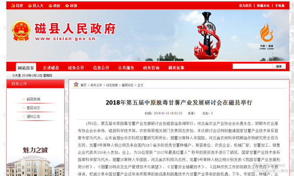 2018年1月8日,第五屆中原脫毒甘薯產(chǎn)業(yè)發(fā)展研討會在河北磁縣溢泉湖隆重舉行。得到各大報紙、網(wǎng)絡媒體的關(guān)注。